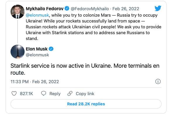 Then, on Saturday, when Ukraine's Deputy Prime Minister and Minister of Digital Transformation Mykhailo Fedorov tweeted at Elon to provide the Starlink service, Elon responded in less than 11 hours that it was life: