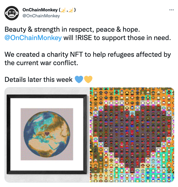OnChainMonkey created a charity NFT to help refugees affected by the current war conflict. Another way to use technology and art to support our fellow human beings in their darkest hours.